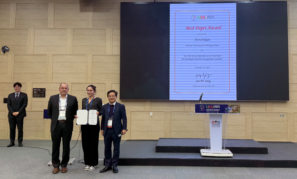 Mgr inż. Daria Pałgan zdobyła Best Paper Award podczas szóstej Międzynarodowej Konferencji Nano-Joining & Micro-Joining, która odbyła się w dniach 17-21 listopada w Yeongju, w Korei. Wstąpienie Darii nosiło tytuł "Cu-Mo nanocomposites as an interlayer for joining in thermal management systems".